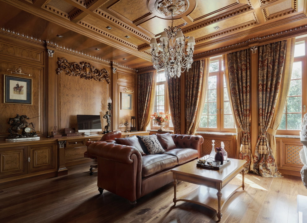 Coffered ceiling structures or dark woods are examples of great taste. They clearly highlight every detail of the interior and give it a royal and noble look.