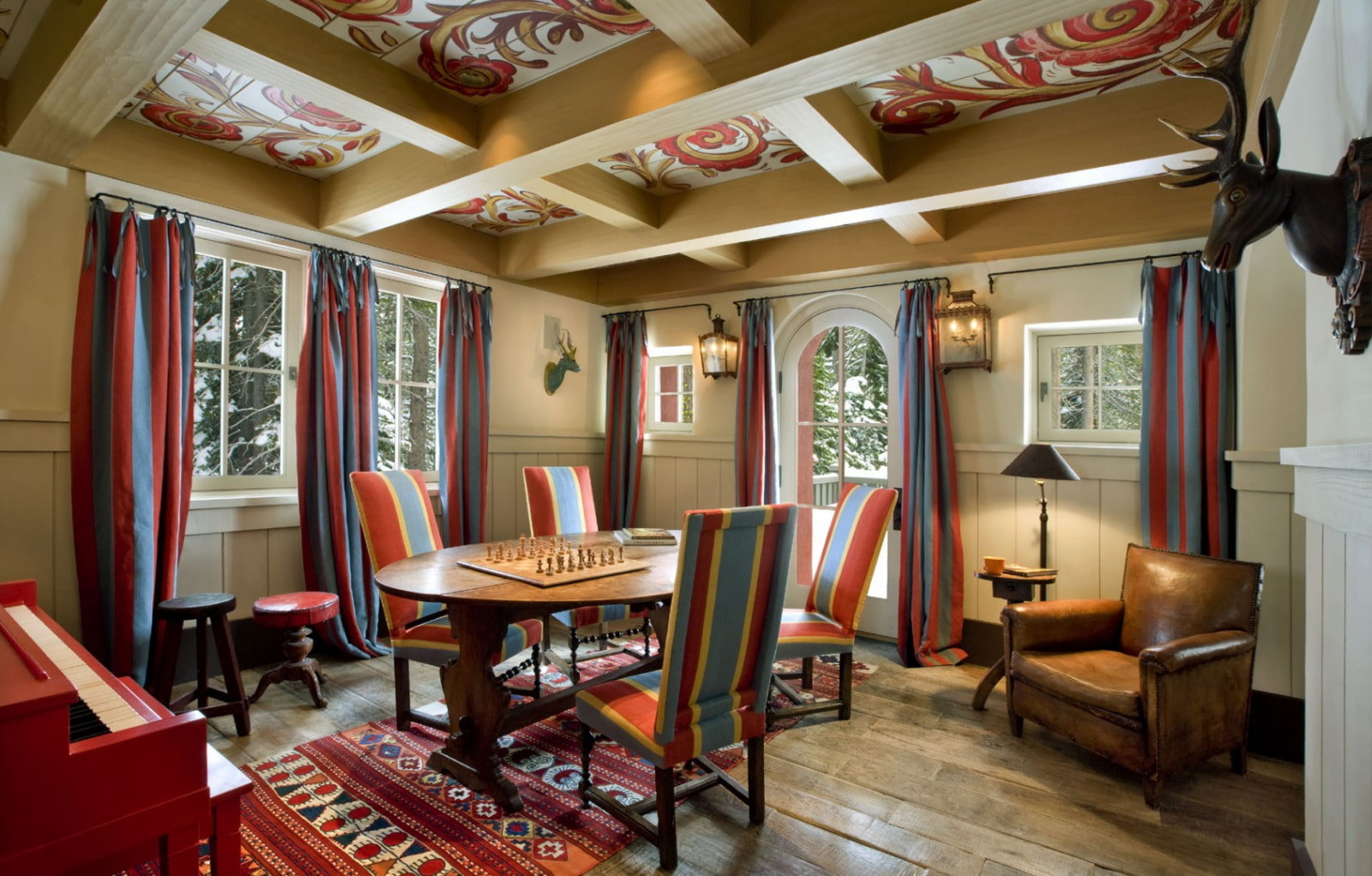 Massive beamed ceilings or a variety of other structures in darker colors, such as brown, chocolate or mahogany, will come in handy in the Alpine style.