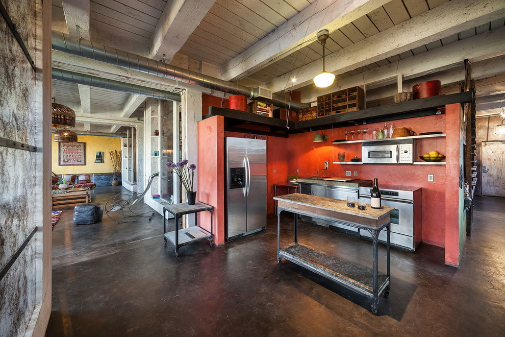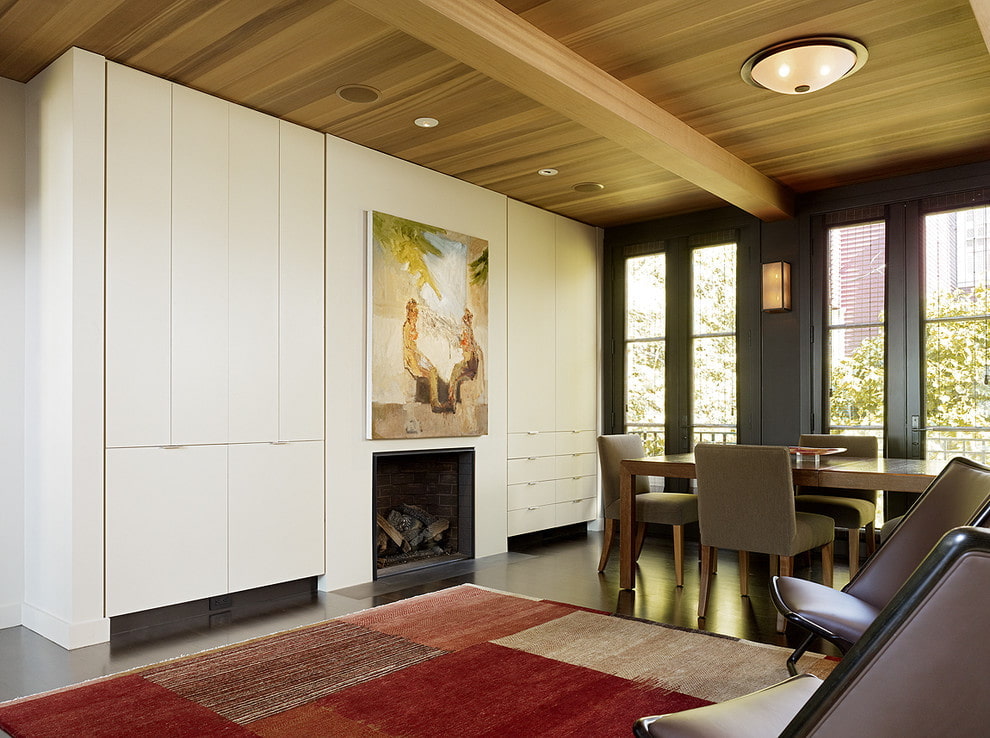 False girders have many advantages, they are lightweight, strong and durable. The ceiling, finished with open beams, allows you to visually make the room much wider and higher.