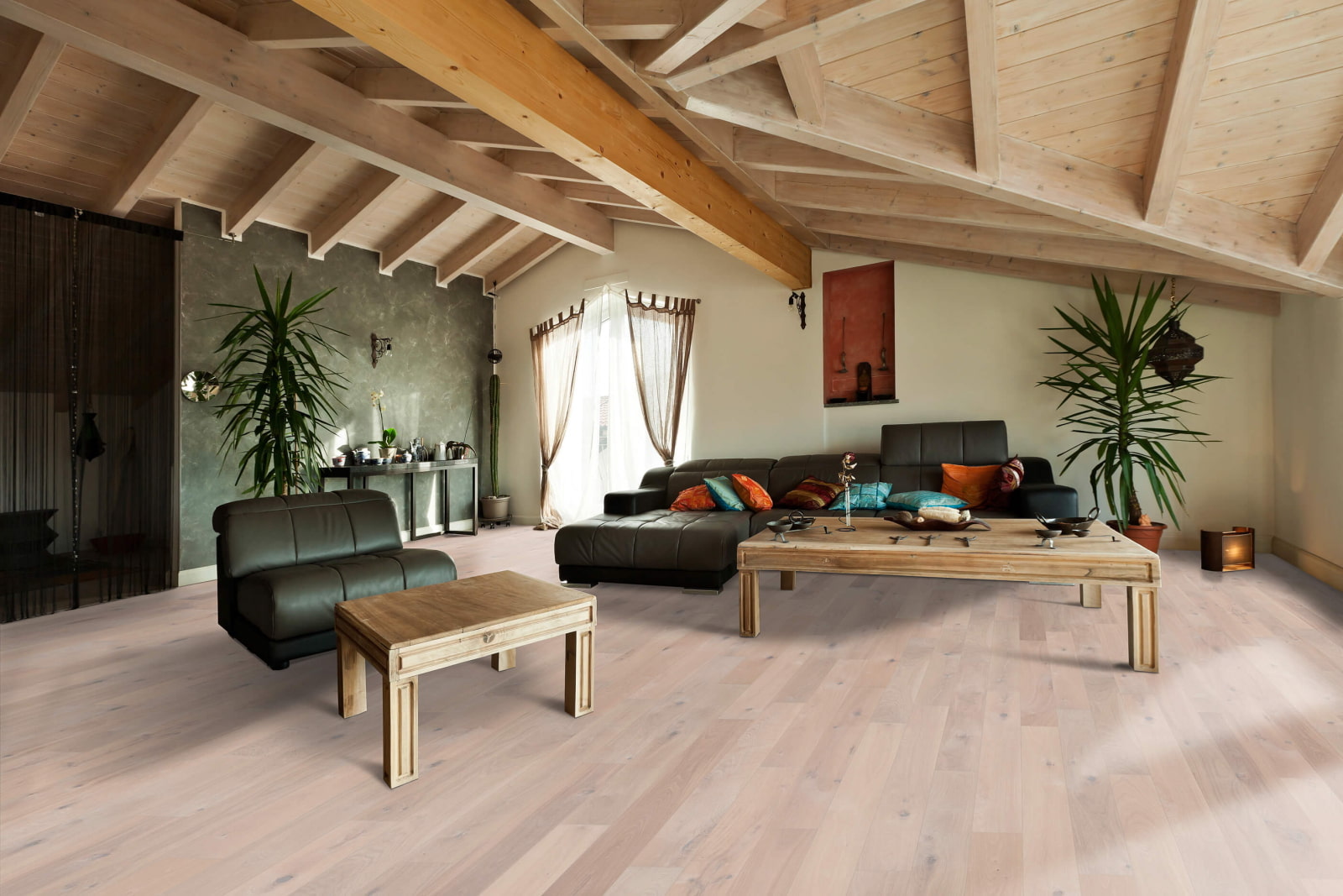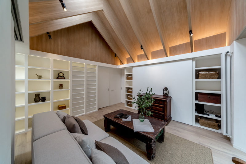 The wooden ceiling enhances the interior of the room and makes it truly special.