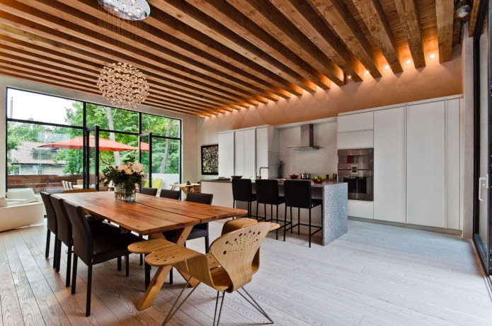 In the photo there are wooden MDF panels on the ceiling in the interior of the kitchen.