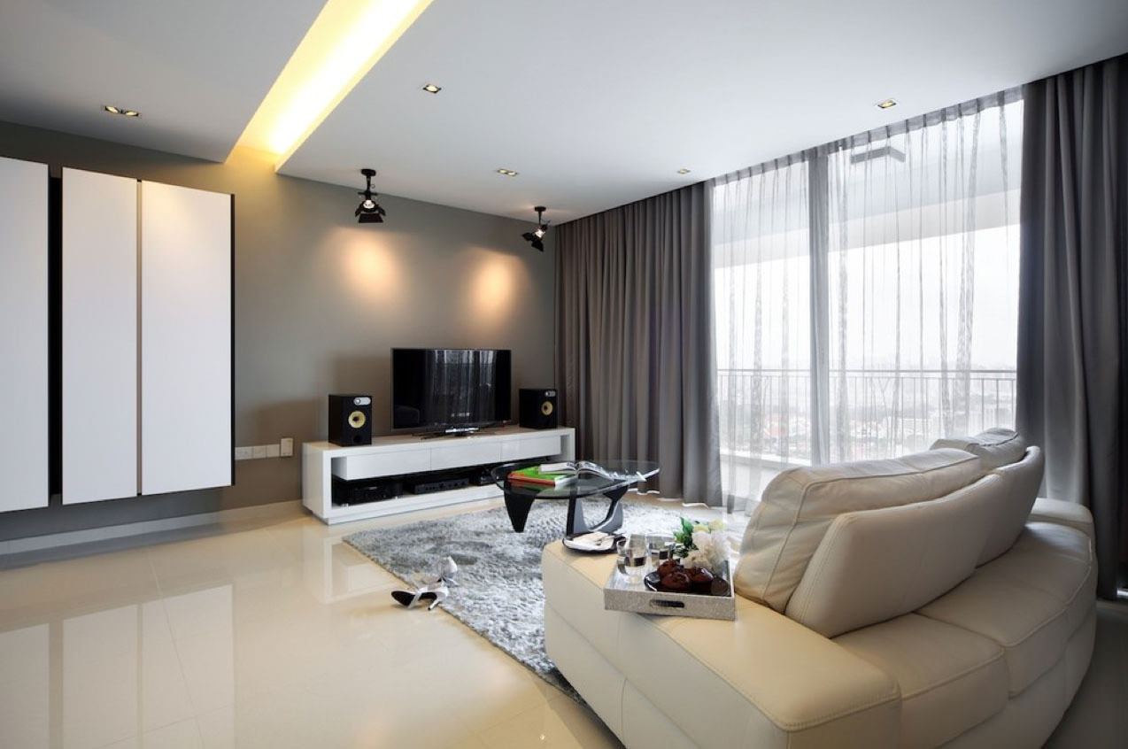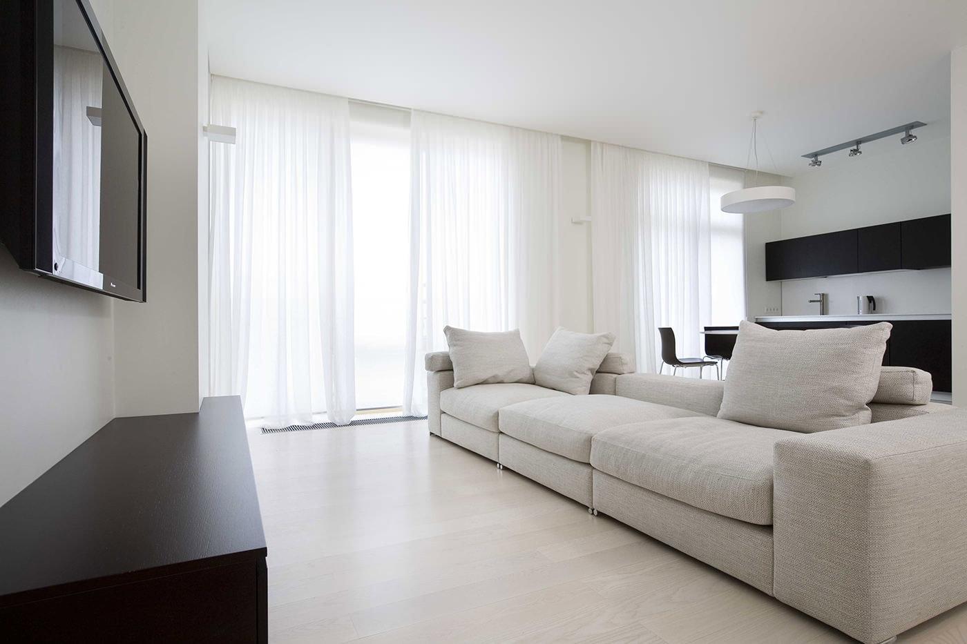 Large windows are made in cases where they are not going to obstruct landscapes beyond the window, so their complete absence is considered ideal curtains. So that the room is not too bright, you can use tinted glass or chameleon glass in the double-glazed windows, which change the transparency depending on the illumination. In the event that design curtains are still desirable, choose very light, translucent tulle or organza curtains. If the style of the interior allows, use roman blinds.