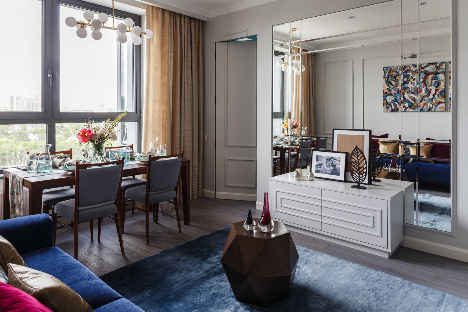 The possibilities of mirror canvases are endless: they increase the amount of light and complicate the space. At the same time, it is important not to overdo it and not turn the room into a mirror maze. One large mirror in the living room is enough, two vertical ones in the bedroom.