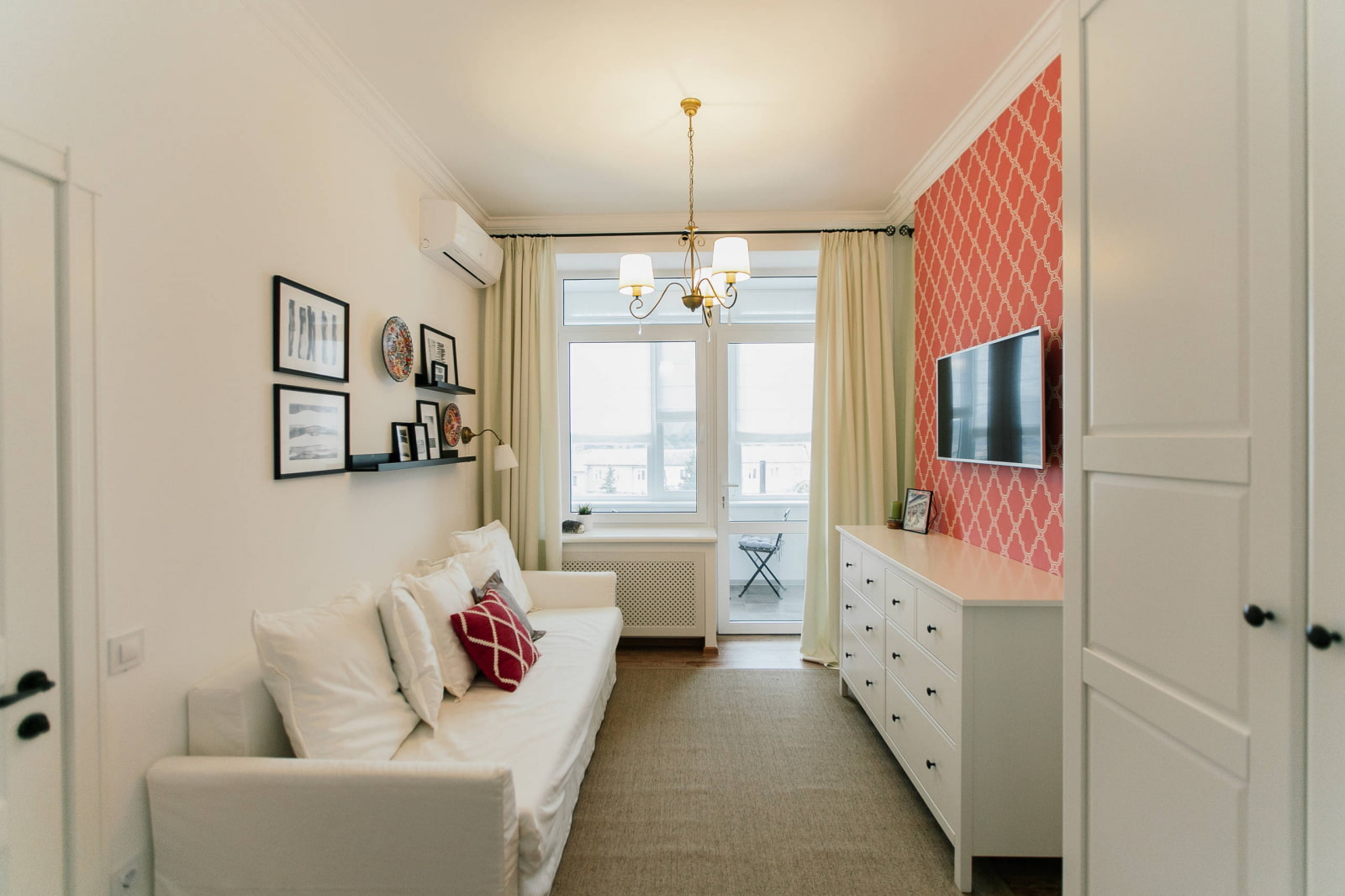 When arranging a small room, you should choose small-sized furniture: huge corner sofas and massive armchairs can look out of place and too cumbersome. But floor-to-ceiling cabinets are the right solution. Having merged with the wall, they do not put pressure on the space, especially if the doors are glossy or made to match the walls.