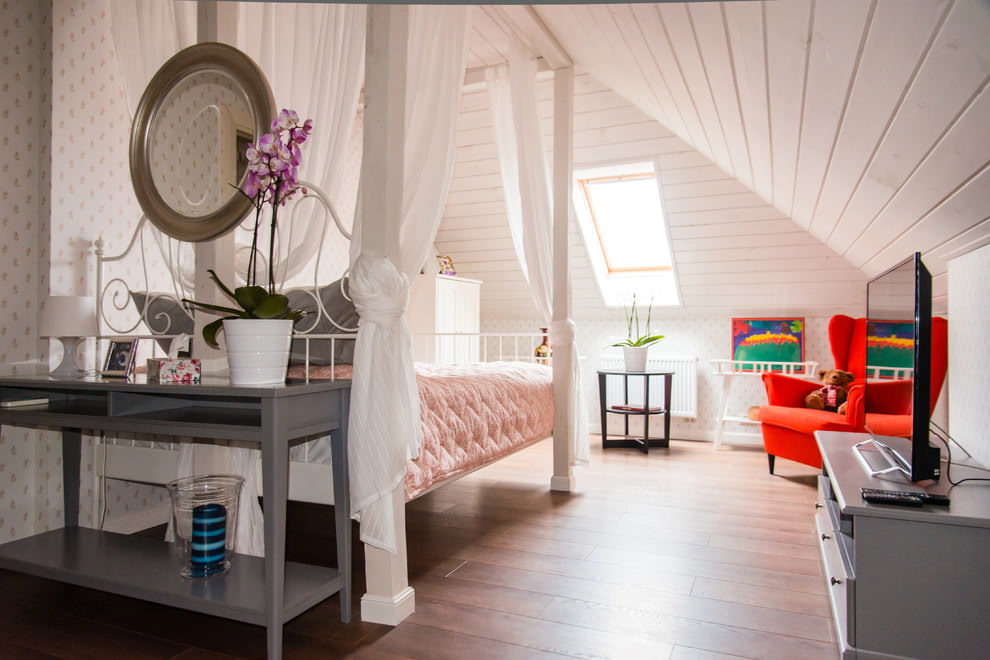 The design of the attic room most often requires the arrangement of the bedroom. The placement of this space does not require a supply of communications (except for electricity), and when using it, you do not have to constantly go upstairs - just go up before bed and go down in the morning.