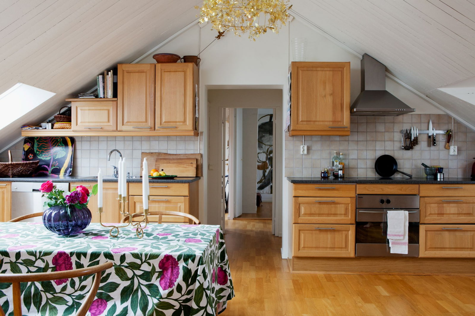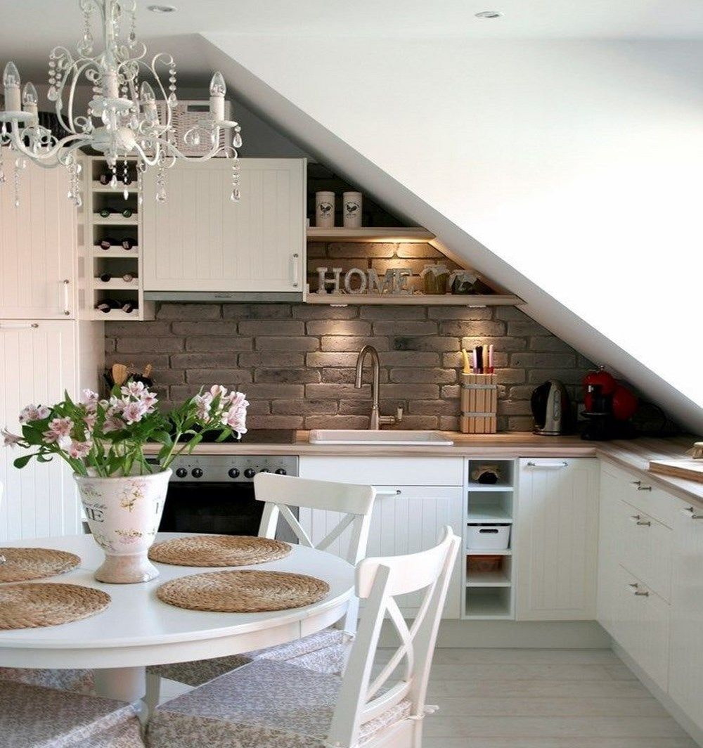 It is rarely placed on the attic floor. Firstly, you will definitely have to pull plumbing, sewerage, electricity and (possibly) gas to the kitchen. Secondly, the kitchen is one of the most visited in the house, and walking back and forth is simply inconvenient. Thirdly, two walls at an angle create a lot of problems with the placement of the kitchen unit.