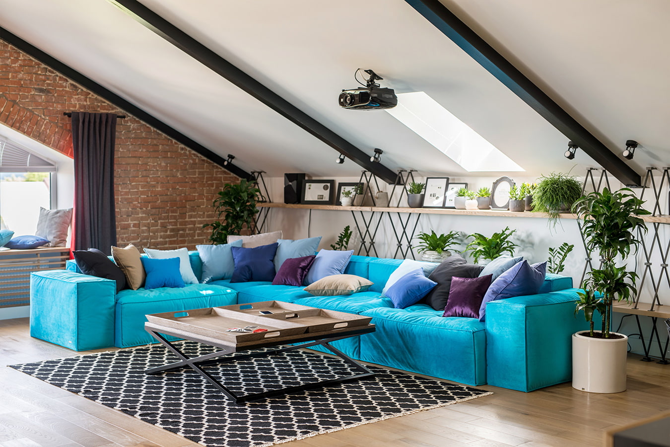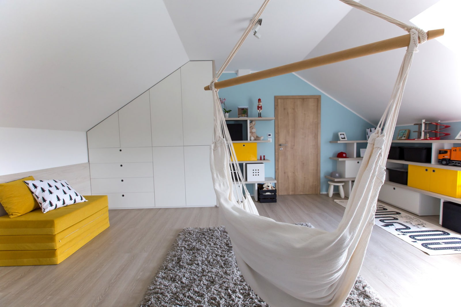 In an attic floor design, it is not always assumed that a specific function is limited, such as sleeping or working. There may be a lounge area where you can read, play games, watch movies, receive guests.