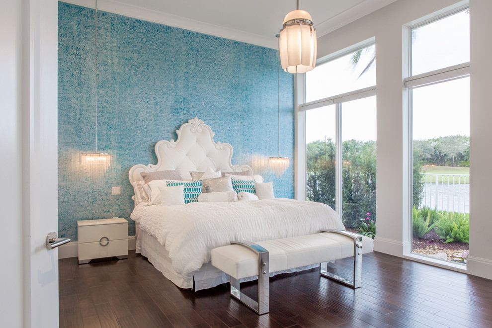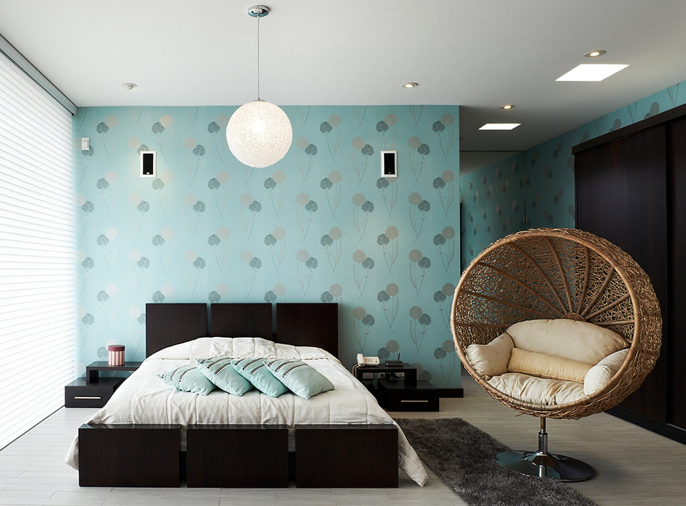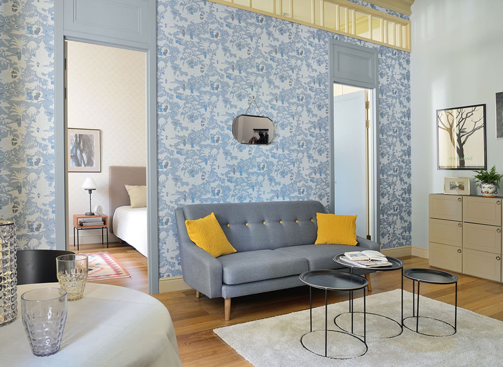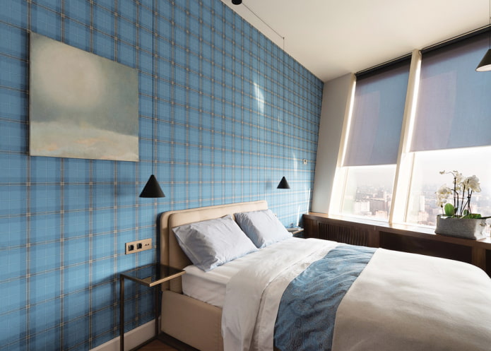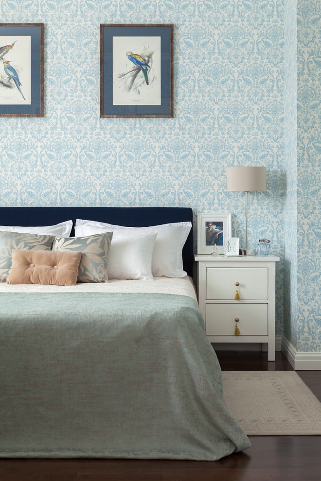 Wallpaper without a pattern and pattern can be pasted over the whole room or just one wall. They are combined with white or contrasting moldings. Wallpaper in blue tones does not look boring, since the emphasis is on the texture (waves, herringbone, speckled, polka dots, etc.) of vinyl or glass wallpaper. Neutral styling is suitable for modern, Scandinavian and classic interiors.