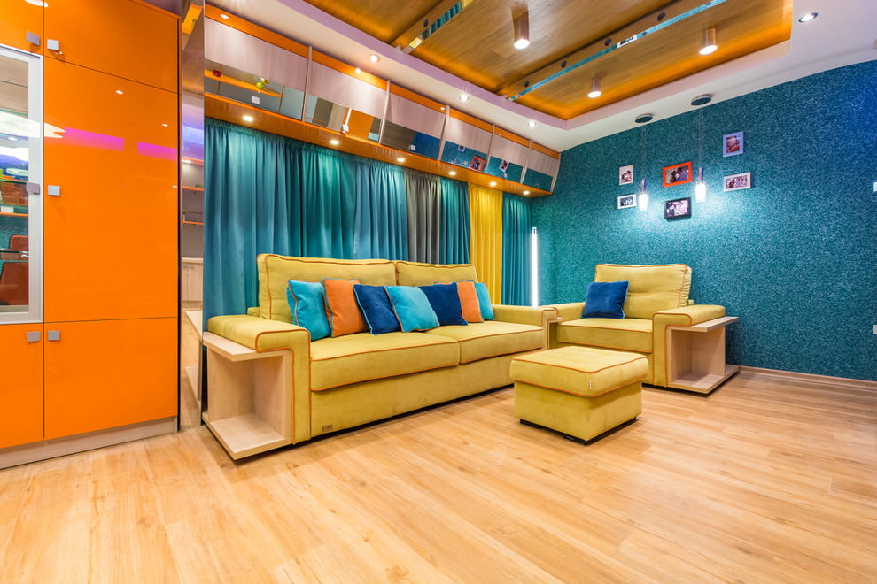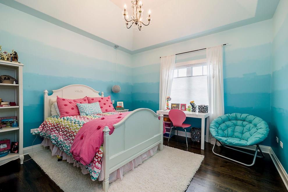 Can be pasted over in bright or pale blue. Also, blue can be used to decorate only the recreation area, combining it with a pale orange work area. Traditionally, blue shades are found in the boys 'room, but when combined with white and pink, then this option is also suitable for girls' bedrooms.