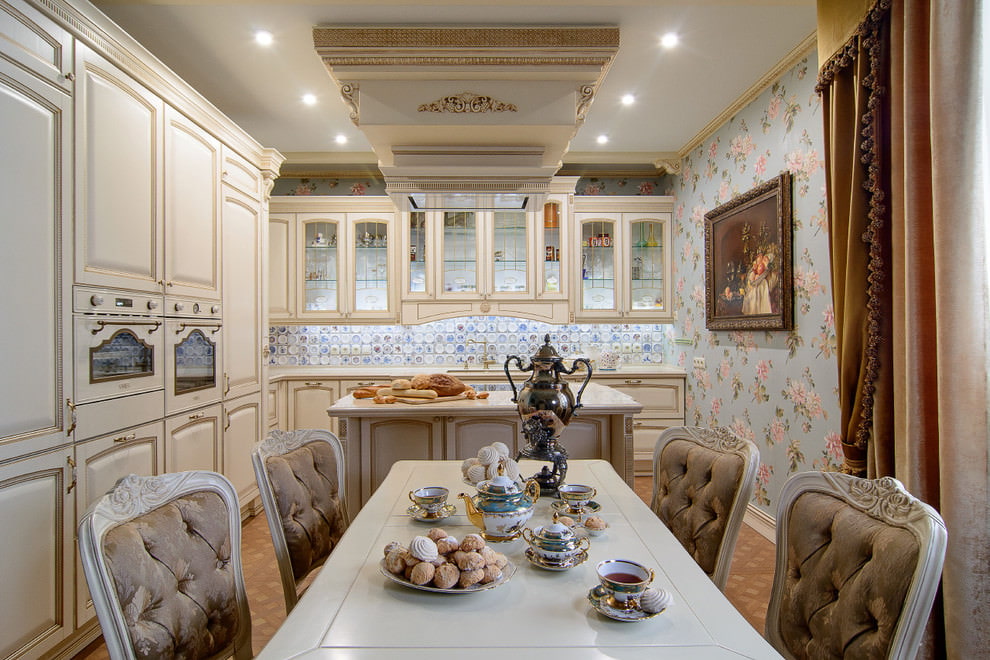 On the picture an example of a blue Victorian kitchen with a classic small solid color ornamentation that does not diminish the space of a small kitchen. Blue wallpapers are combined with Roman striped curtains in harmonious colors.