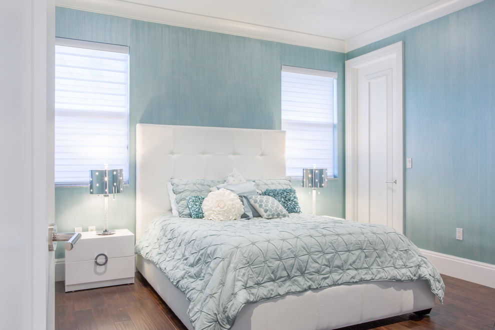 On the picture a sky blue bedroom design that looks fresh with a large window, white accents and a glossy ceiling that reflects daylight.