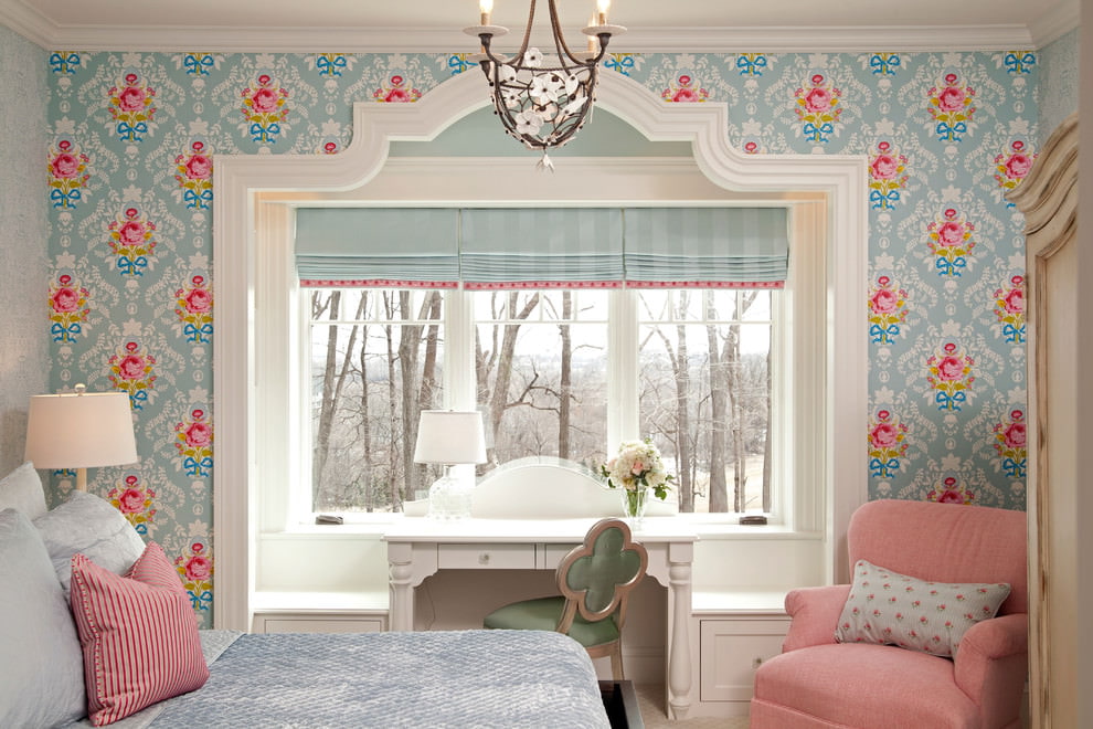The combination of pale pink abstraction or flowers on a blue background is suitable for the Provence style. This tandem of colors can be diluted with white textiles and dark brown furniture.