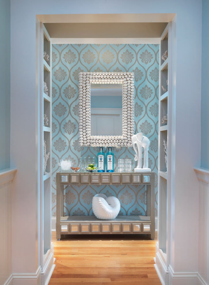 Below are photo examples of wall decoration with blue wallpaper.