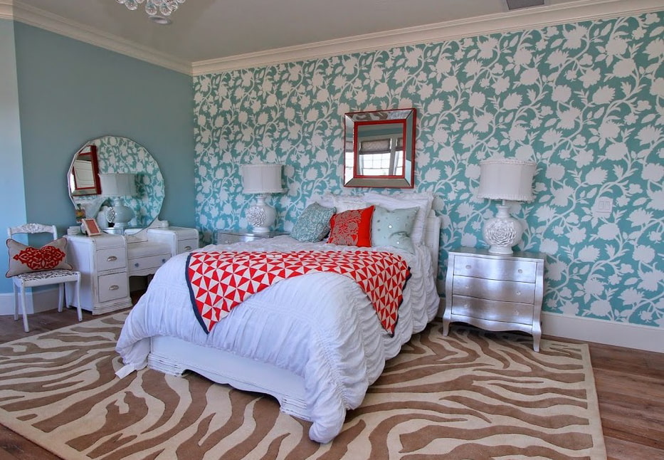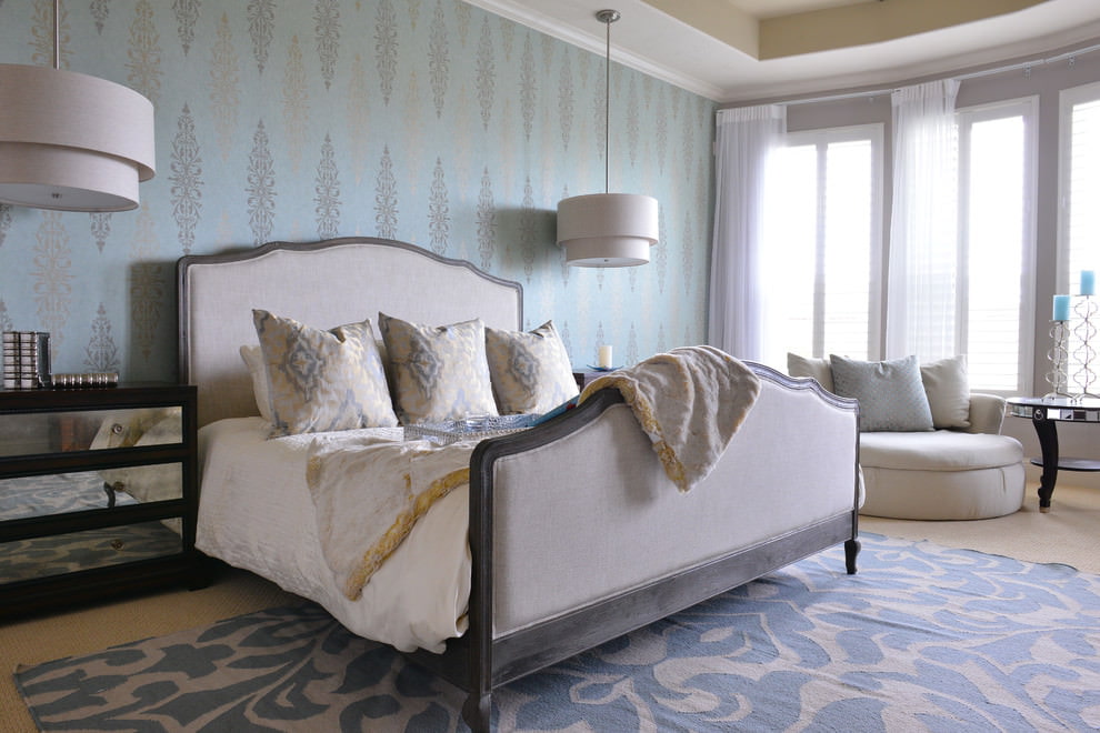 On the picture in the bedroom, blue wallpaper with geometric patterns in white accentuates the wall at the head of the bed and the central part of the ceiling, highlighting the seating area.