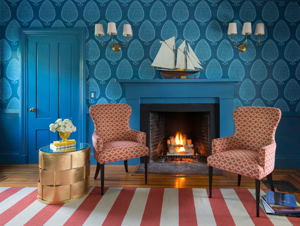 On the picture a blue and white living room in a nautical style, where wallpaper serves as a background for interior items.