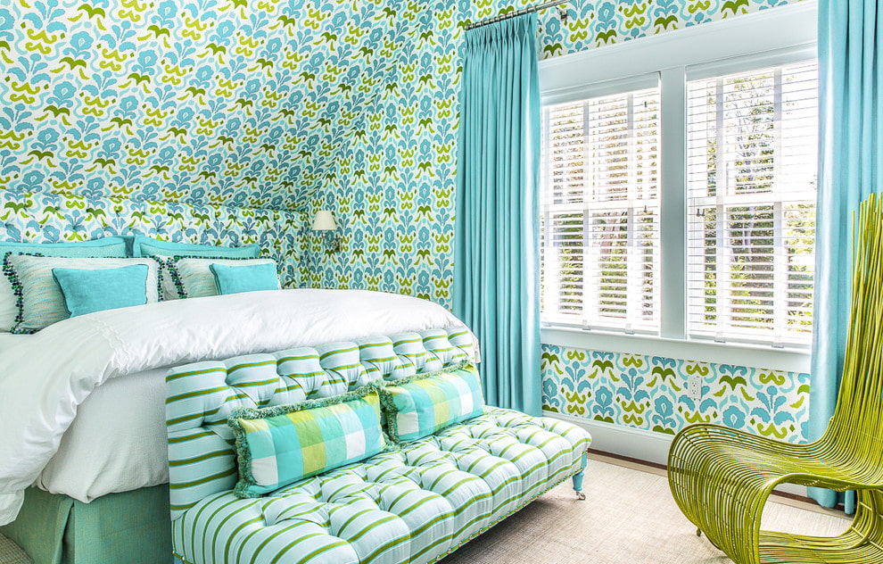 Wallpaper can be combined with one color that is close to blue (white, blue, aquamarine, turquoise, brown). In this case, cyan will be the background for the companion color. Also, wallpaper can be combined with lively contrasting colors of warm colors (orange, yellow, red) in moderation. These can be curtains, accessories, decor and textiles.