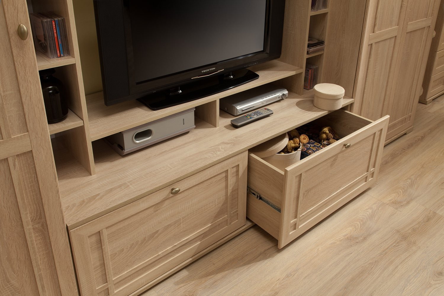 The warm texture of the wood is unique add coziness to the main room of the house... A large object (wall, console) or small decor - a coffee table, a flower stand can be made in the color of sonoma oak.