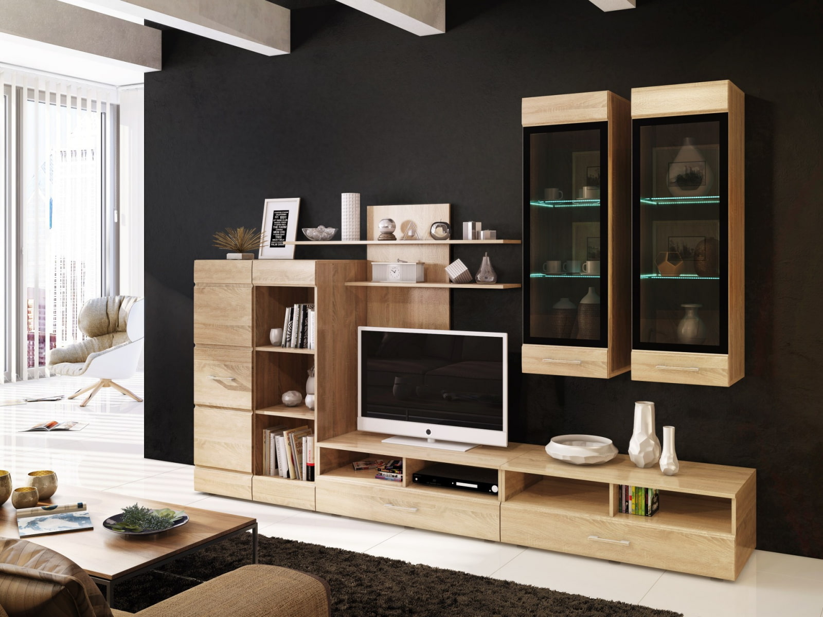 Let's start with the largest options - furniture sets. Wall in the shade of oak sonoma itself will look faded, so it is better to complement its design with additional elements. Inserts made of glossy monochromatic MDF of any color, tinted glass or dark wood are suitable.