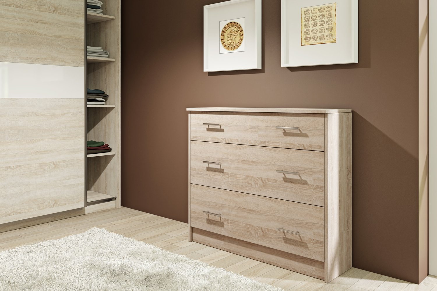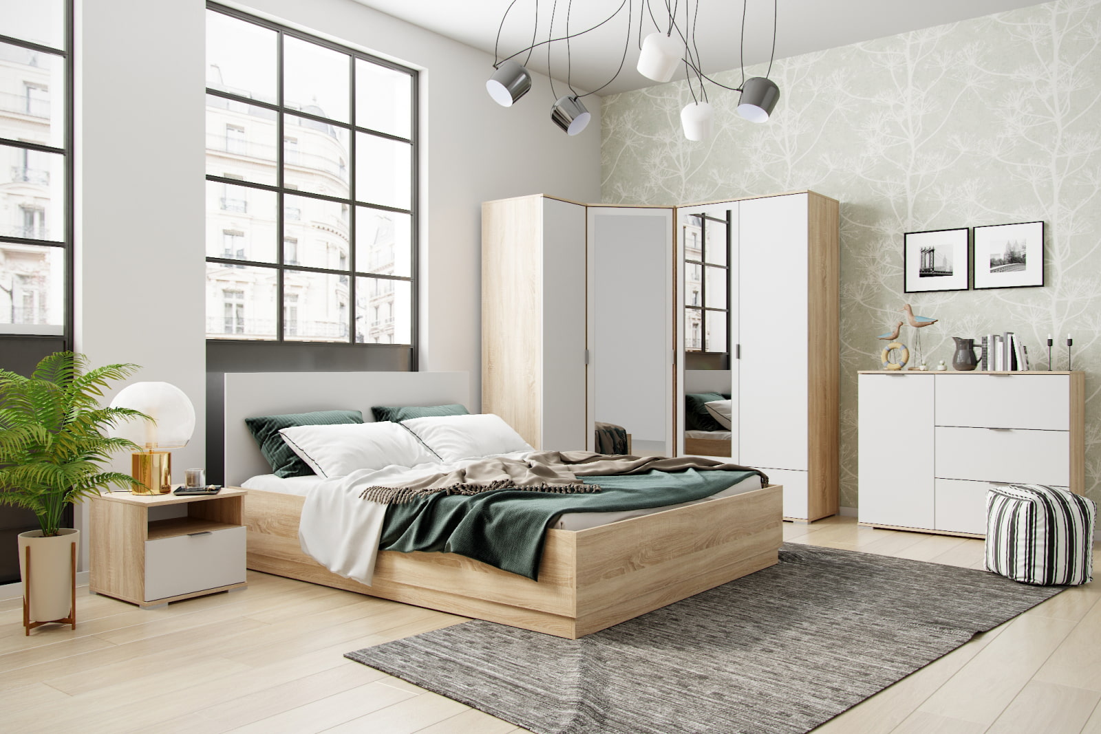 Wardrobes or chests of drawers made of light oak will perfectly make friends with both a bed in color and more modern models with circular upholstery. Combine with neutral soothing tones: pearl, gainsborough, almond, linen.