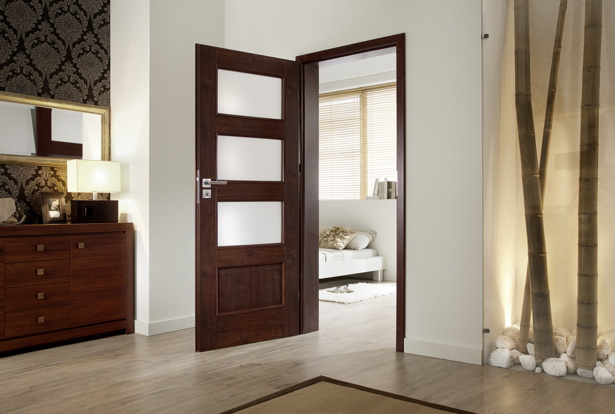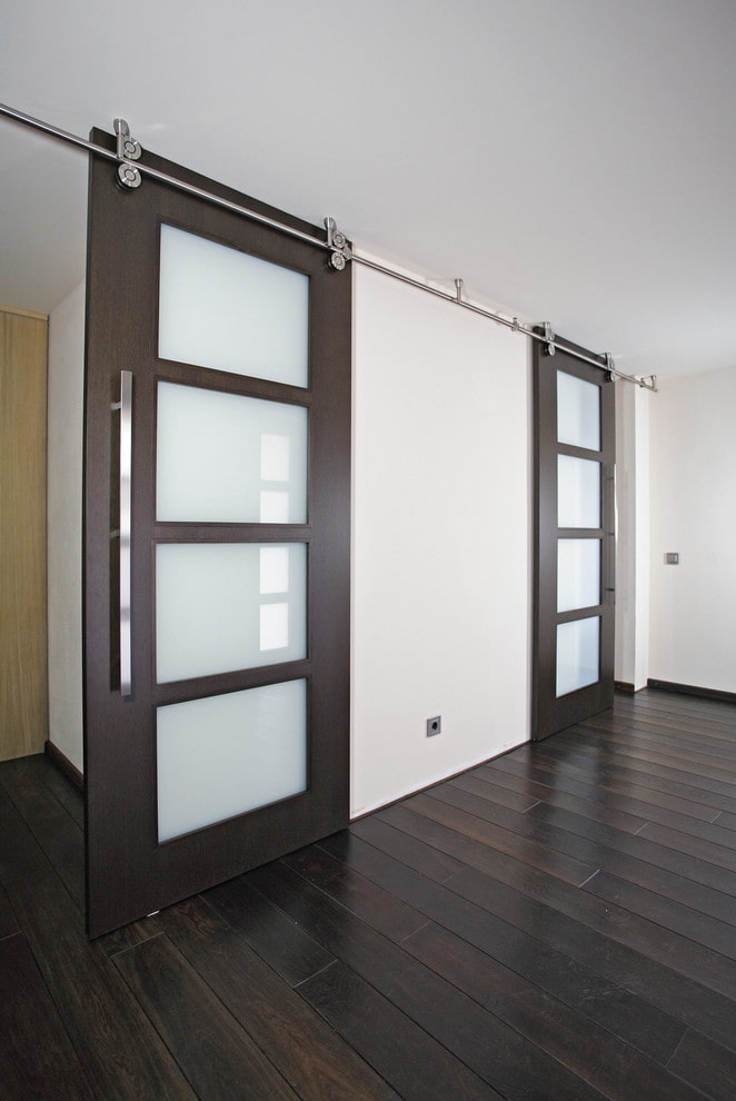 Door designs with white glass will bring additional lighting to the room and give it some lightness.Models decorated with dark glass are an extraordinary, but at the same time very aesthetic solution that preserves the illusion of a closed space in the room.