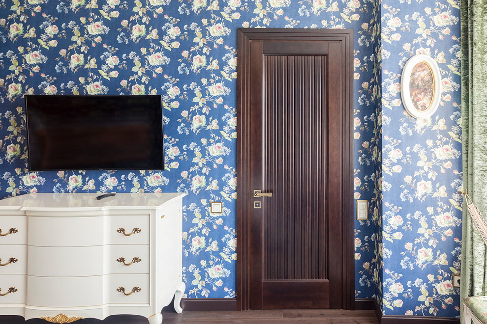 In the photo there is a dark wenge door in combination with patterned blue wallpaper in the interior of the apartment.