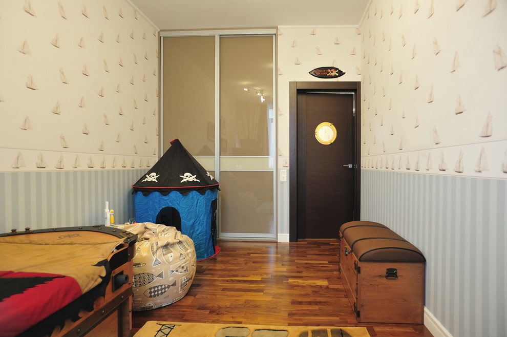 In the photo there are doors in dark wenge color, stylized as the entrance to the cabin in the interior of the nursery in the apartment.