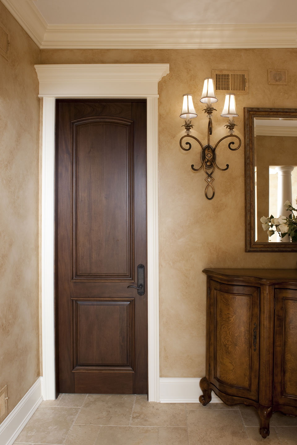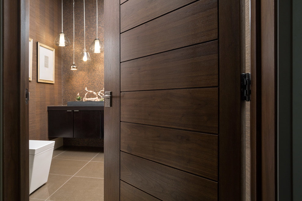 The photo shows the interior of a bathroom with a wenge paneled door.