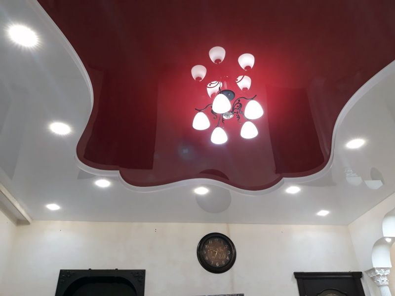 In the photo there is a children's and a stretch ceiling structure with a combination of white and red colors.
