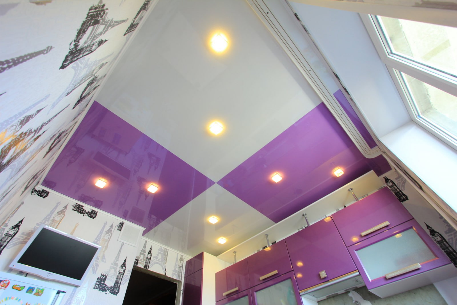 In the photo there is a white stretch ceiling with bright pink accents in the interior of the kitchen-living room.