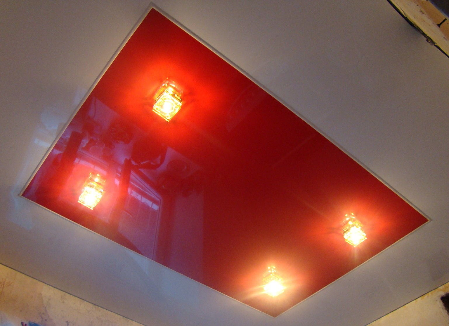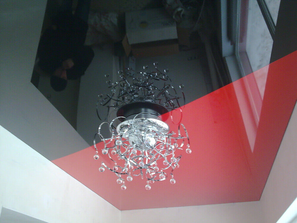 The photo shows a two-tone red and white stretch ceiling in the hallway.