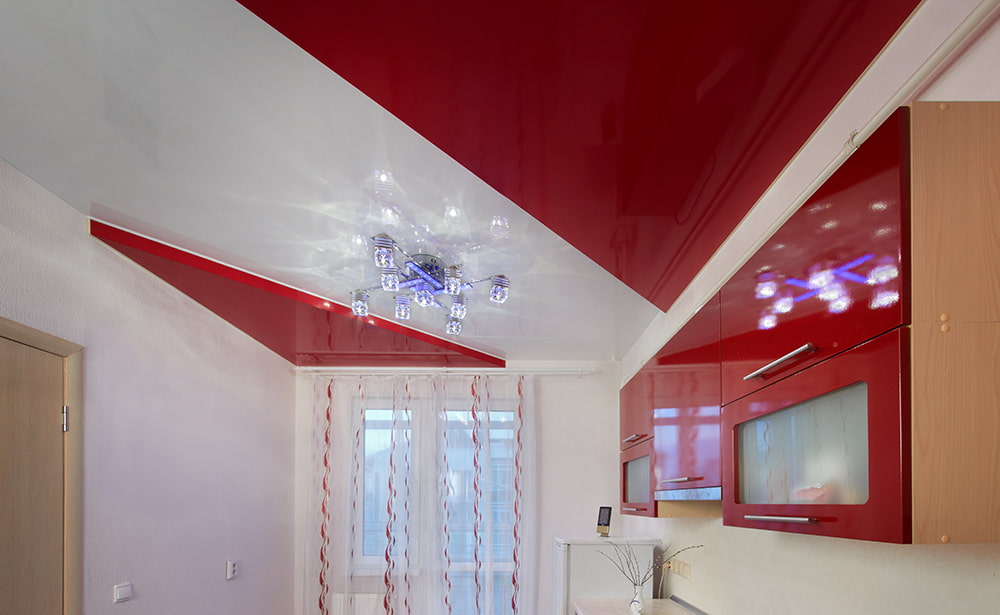 Pictured is a two-tone red and white glossy ceiling model in the kitchen.