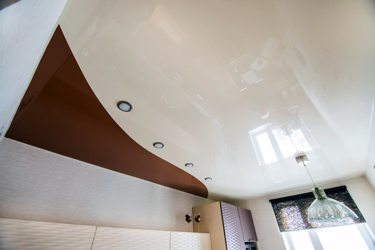 With the help of unusual and interesting color combinations on the ceiling, you can create the most unusual visual spatial effects in the kitchen. Textured, matte models or products from a glossy film will add personality to the atmosphere.