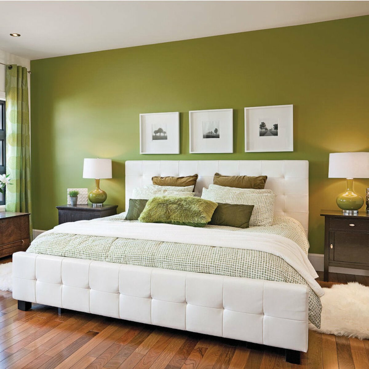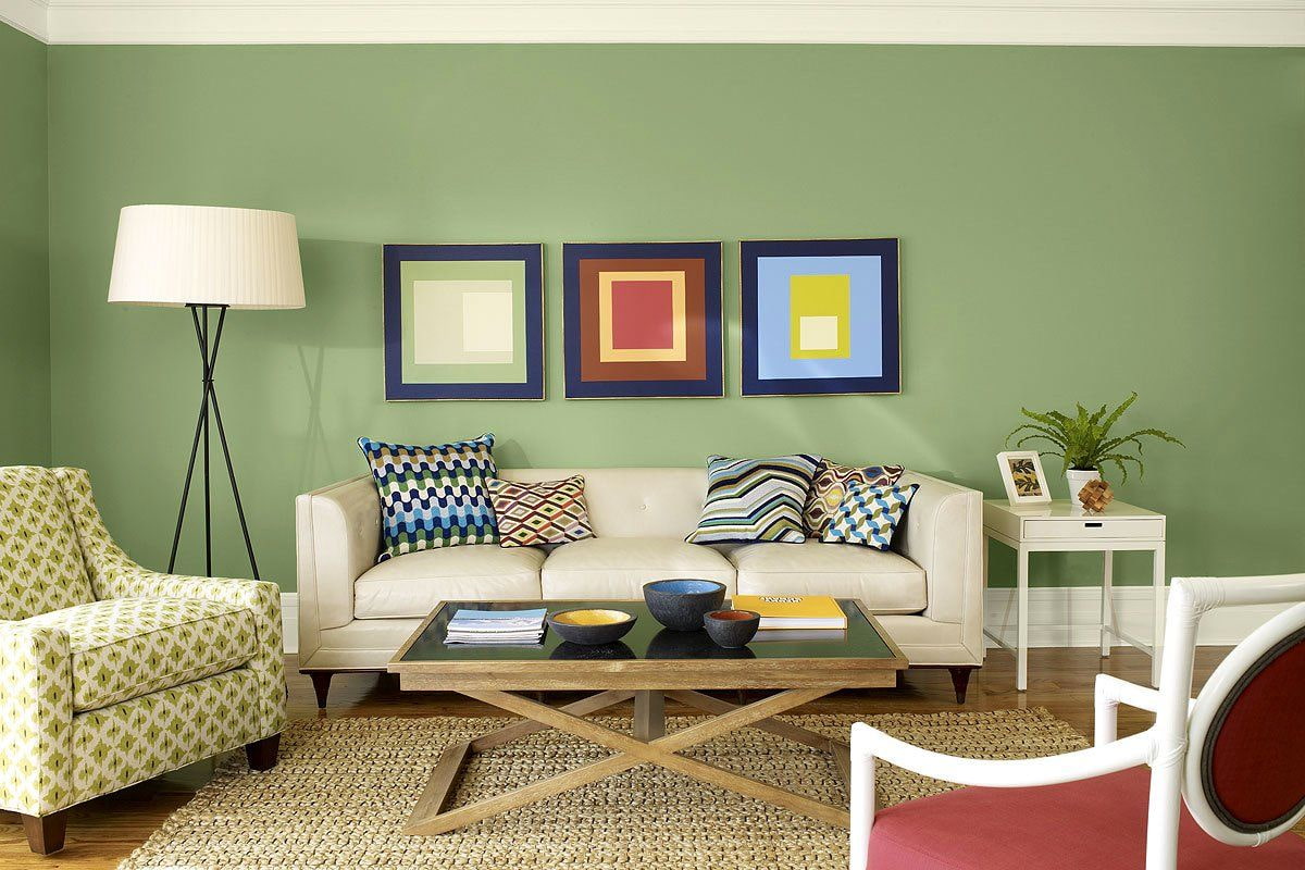 Pictured is a green wall in a modern living room