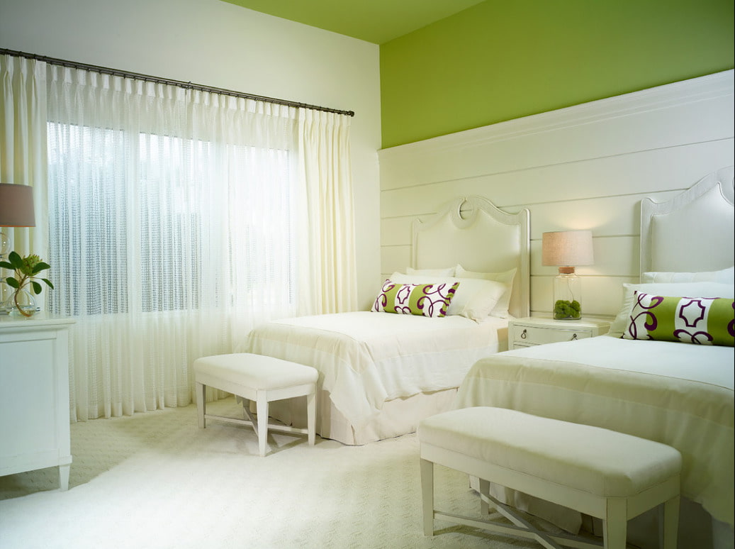 The bedroom in pistachio color looks advantageous and harmonious: besides, after a hard day's work it will be pleasant to relax and take a nap in it. The only caveat: so that after waking up you can feel a surge of energy, dilute the calming green with bright colors: yellow, orange. They should not be visible before going to bed, so it is better to apply them on the wall behind headboard.