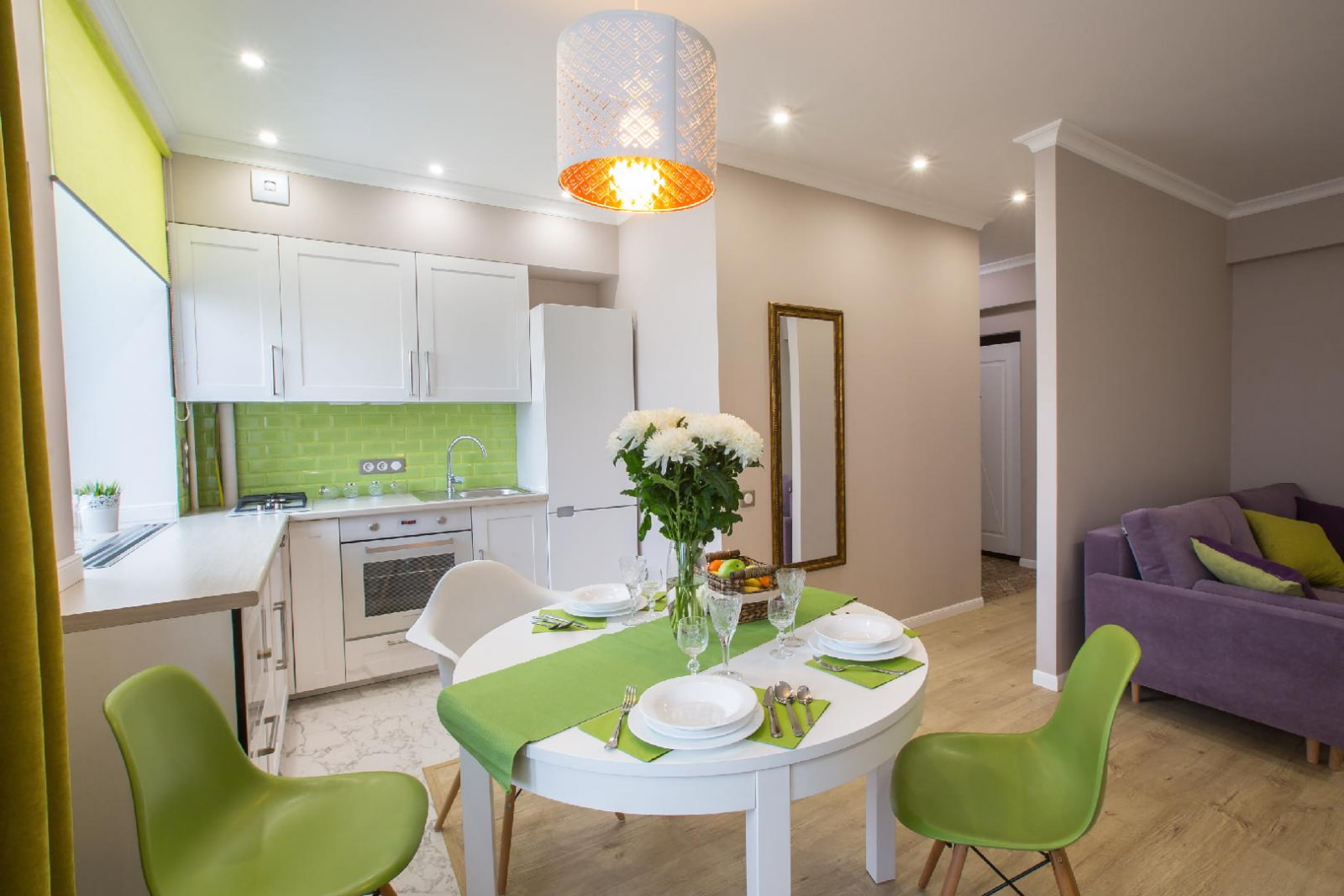 In the kitchen, light greens work to reduce appetite, which makes the pistachio shade ideal for apartment owners who dream of losing weight. Moreover, it can be used not only in decoration or furniture, but also in textiles (tablecloth) or dishes - table plates, cups.