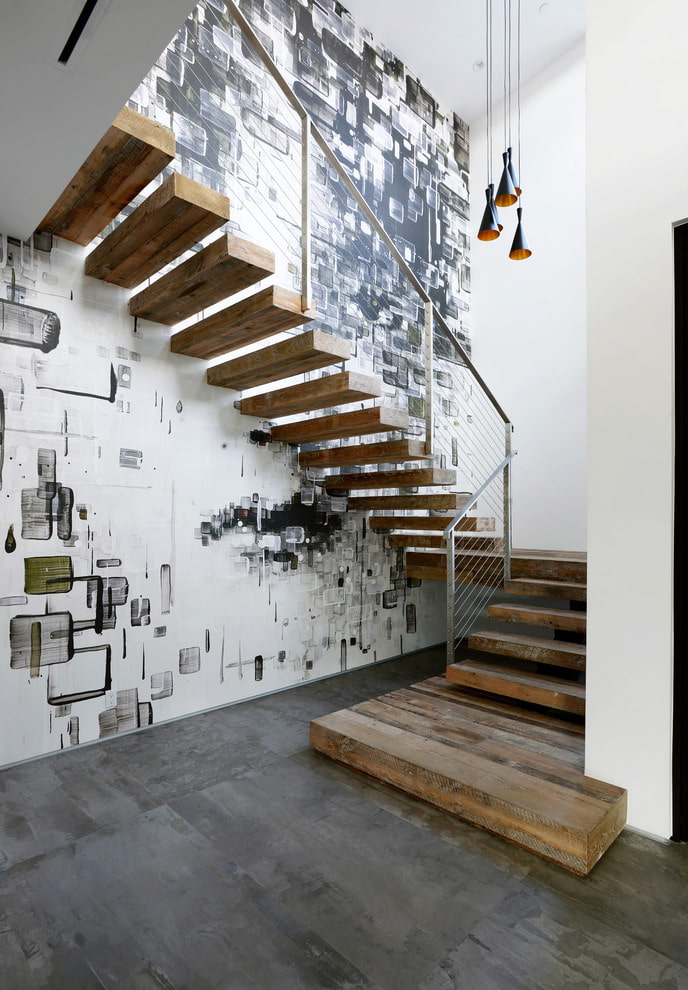 The wall along the stairs of a country house can be decorated with wall murals with imitation of a stone or brick wall and the image of the old city.