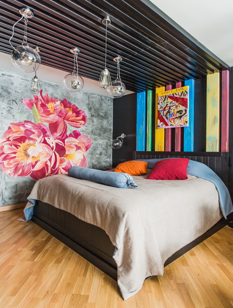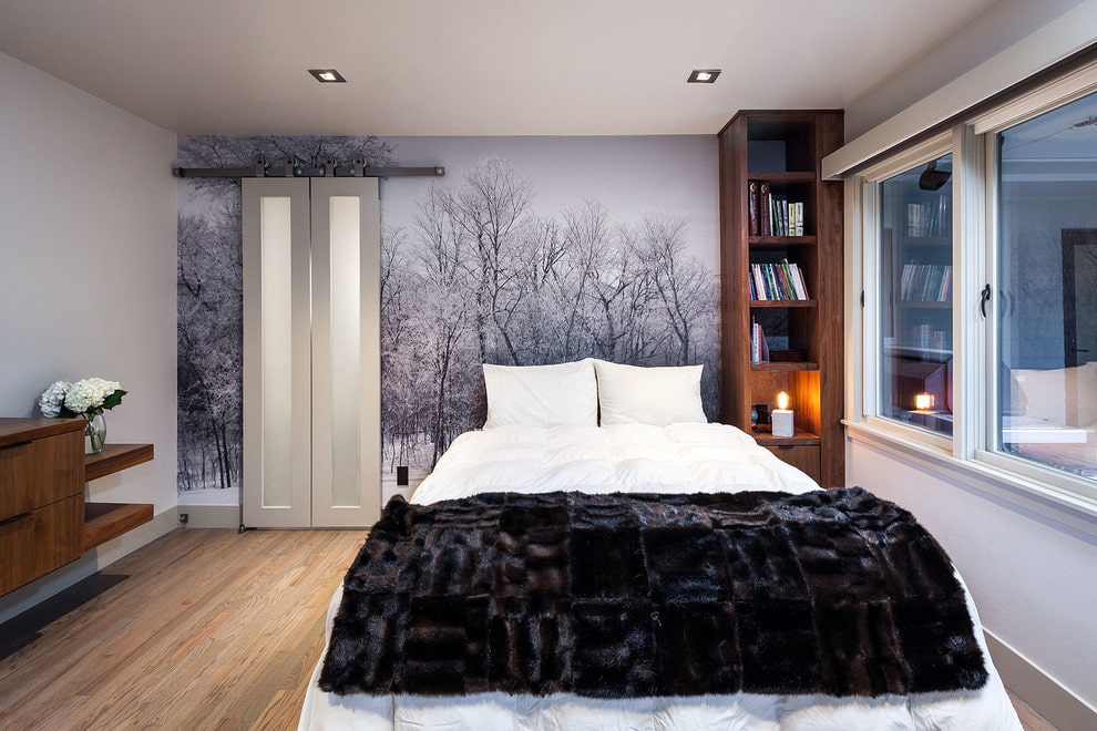 Wall murals above the head of the bed will help define the sleeping area, visually separating it from the rest of the space. In addition, photo wallpaper can be a decorative continuation of the head of the bed.