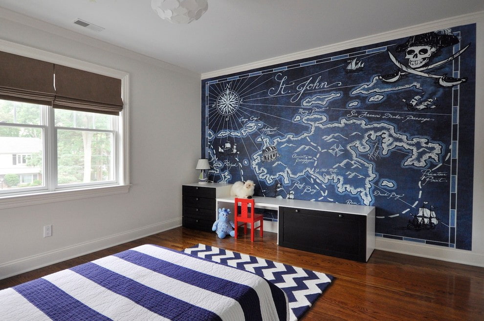 In a minimalistic living room, it will be interesting to look at a photo with a view of the sea or ocean, and in a nursery, ships with pirates and the underwater world.