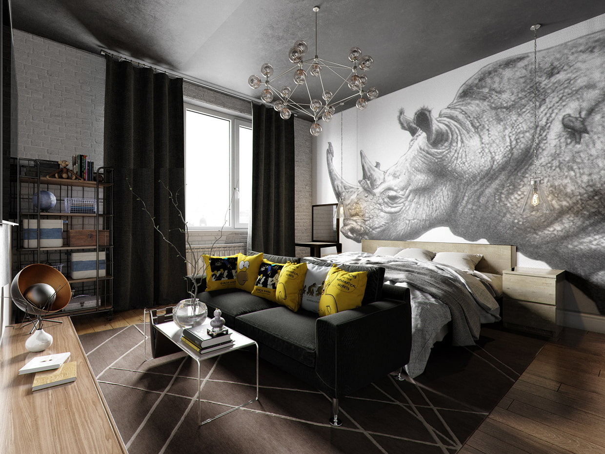 On the picture stylish bedroom interior with black and white photomurals with rhinoceros.