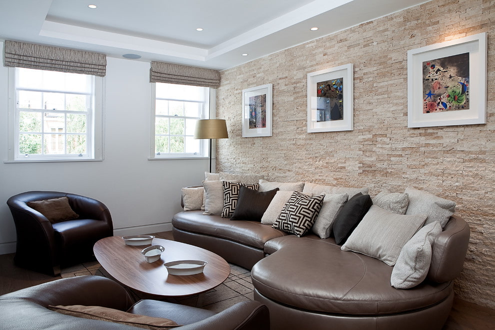 The living room is the place where you can embody any ideas as much as possible. Having decorated the place above the sofa with photo wallpaper, you can designate a recreation area. A sofa and a couple of armchairs will stand out from the general background.