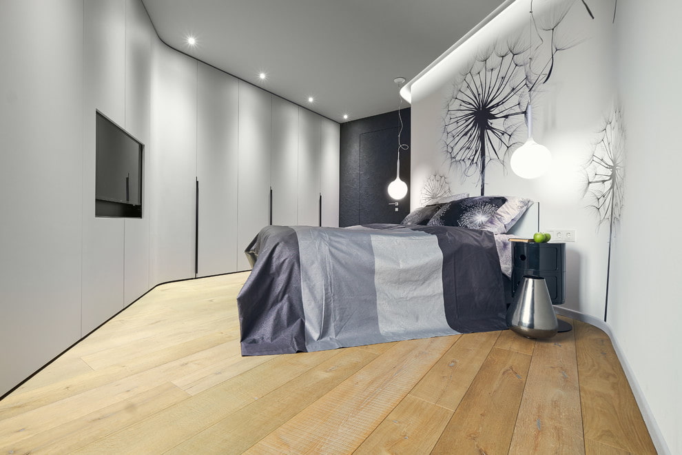 On the picture compact bedroom. The room is visually enlarged by wall murals with a perspective image.