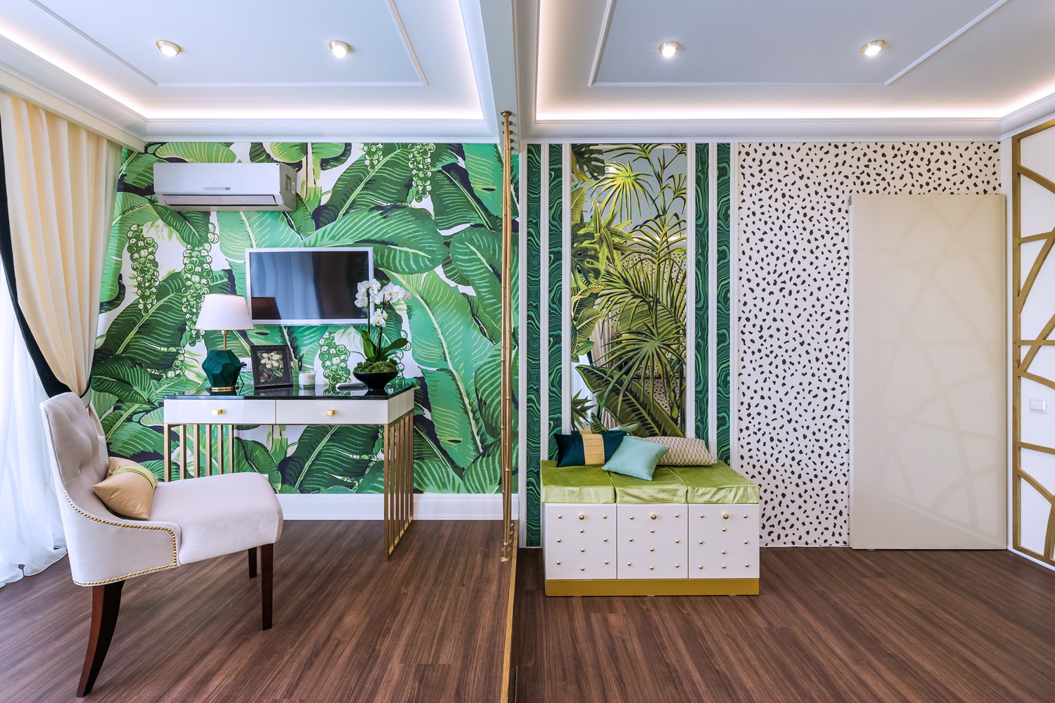 - A deaf image, such as flowers or abstraction, reduces the room by means of a three-dimensional pattern.