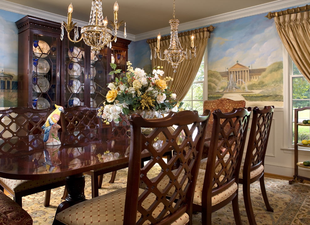 On the picture interior with a thematic fresco from the life of the Middle Ages, which occupies two walls of a spacious dining room in a classic style.