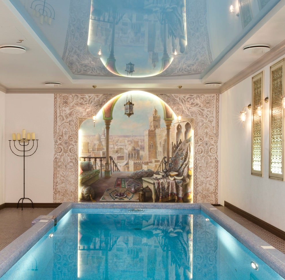 On the picture the image of the sky and the stucco edging on the ceiling create an imitation of a window, making the interior airy. This design works well for low or dark rooms.