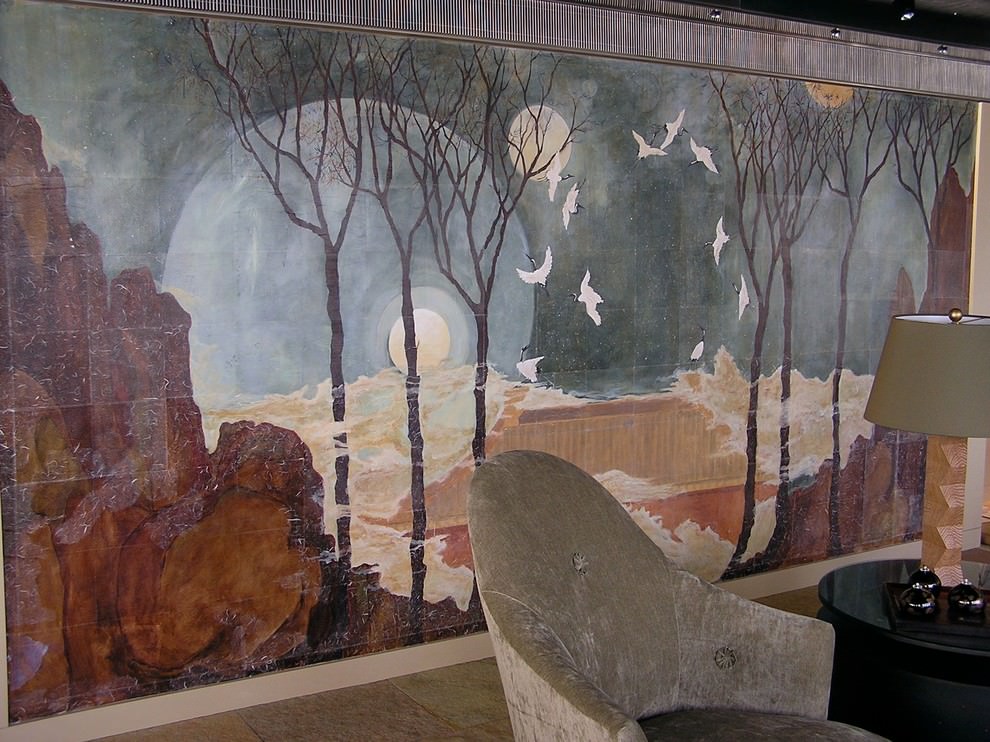 Like photo wallpaper, a fresco in the interior is most often used for wall decor. Its size can be of any format and shape, from square to ellipse. In a large room, it can occupy an entire wall.