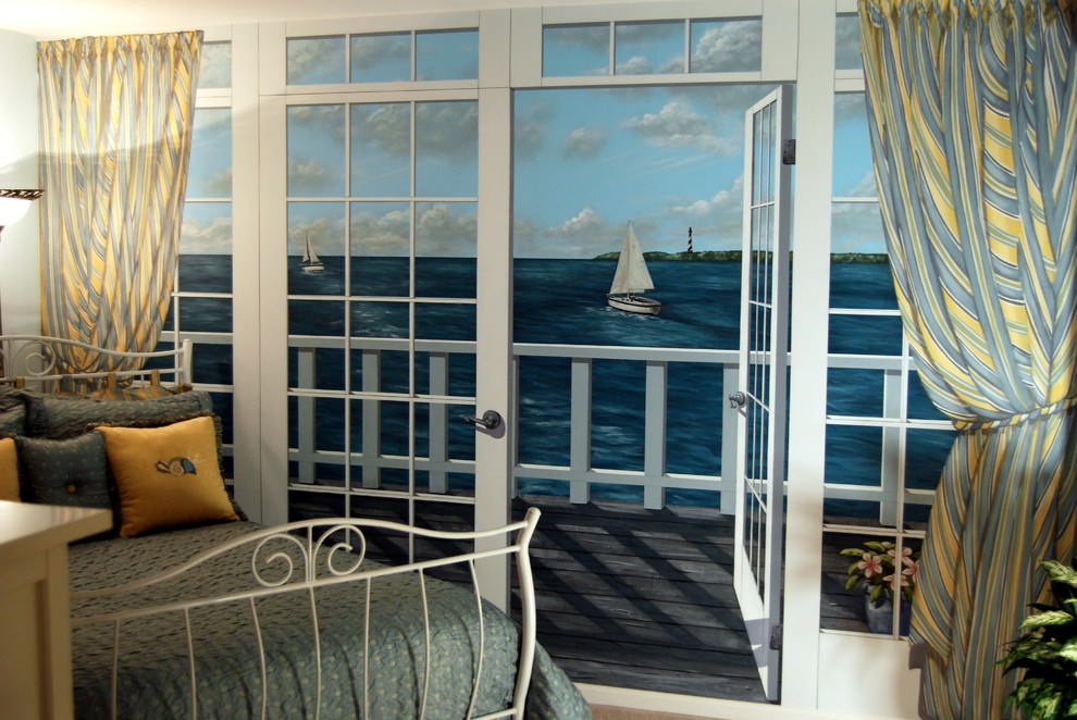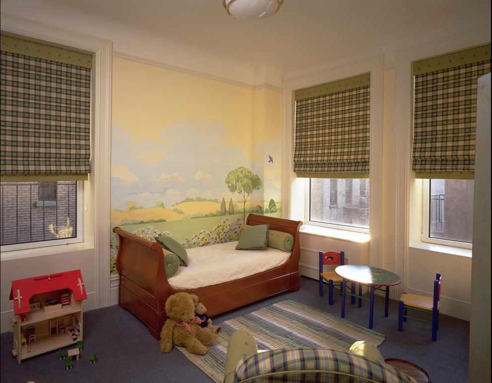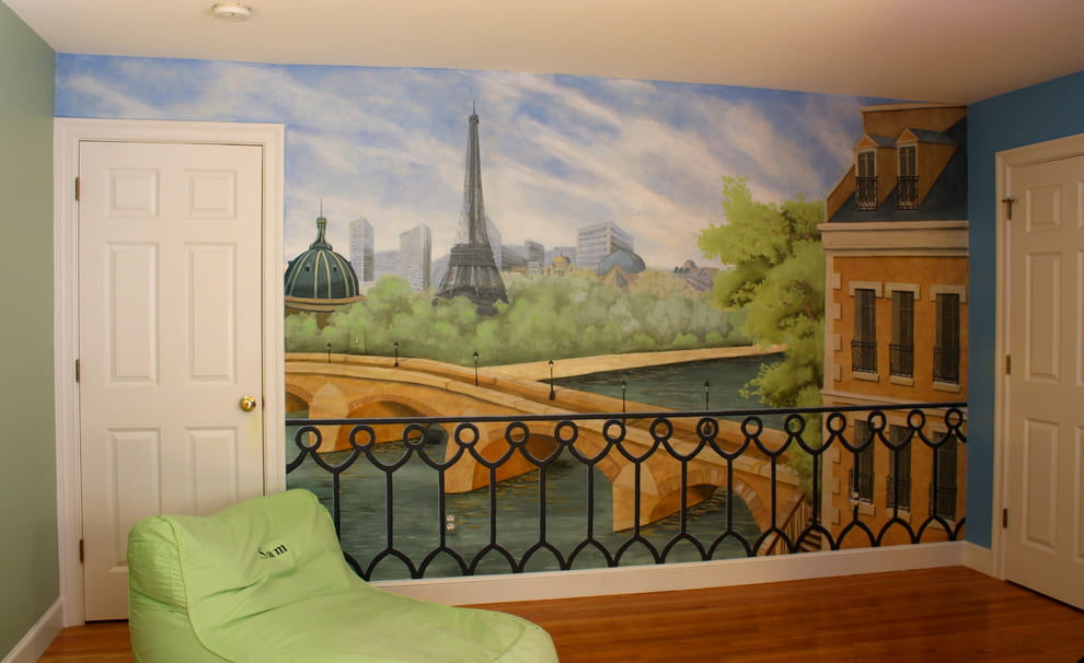 In the interior of a nursery, painting should be understandable for the child. It can be the plot of a fairy tale, a cartoon hero. It is best for the fresco to be in front of the bed so that the baby looks at it before going to bed.