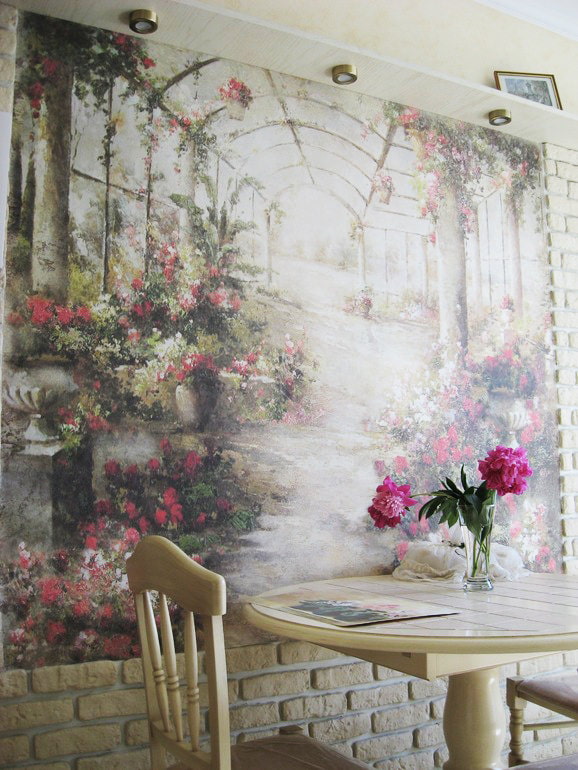 Painting on non-woven fabric is done using a printer for photo wallpaper. After drawing a picture or photo, the image is aged. It can be applied on slightly uneven walls using the technology of non-woven photo wallpaper. Such a fresco can be executed on an entire wall with a landscape of distant Venice or Paris.