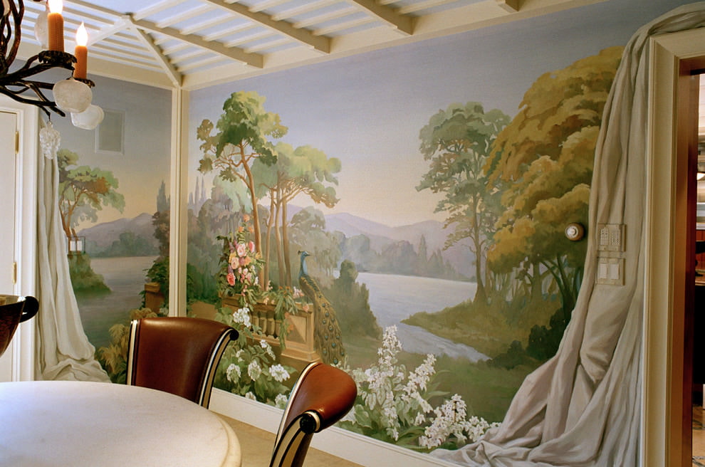 Drawing can divide the room into zones or create an accent. You need to choose the subject of the image based on the style of the room. For a classic interior, you can use famous paintings, stylized portraits from photos, historical panoramas, flowers, the face of a saint. You can also make an iconostasis from frescoes. For the ceiling, a drawing of the sky with clouds, flying birds or angels is suitable.