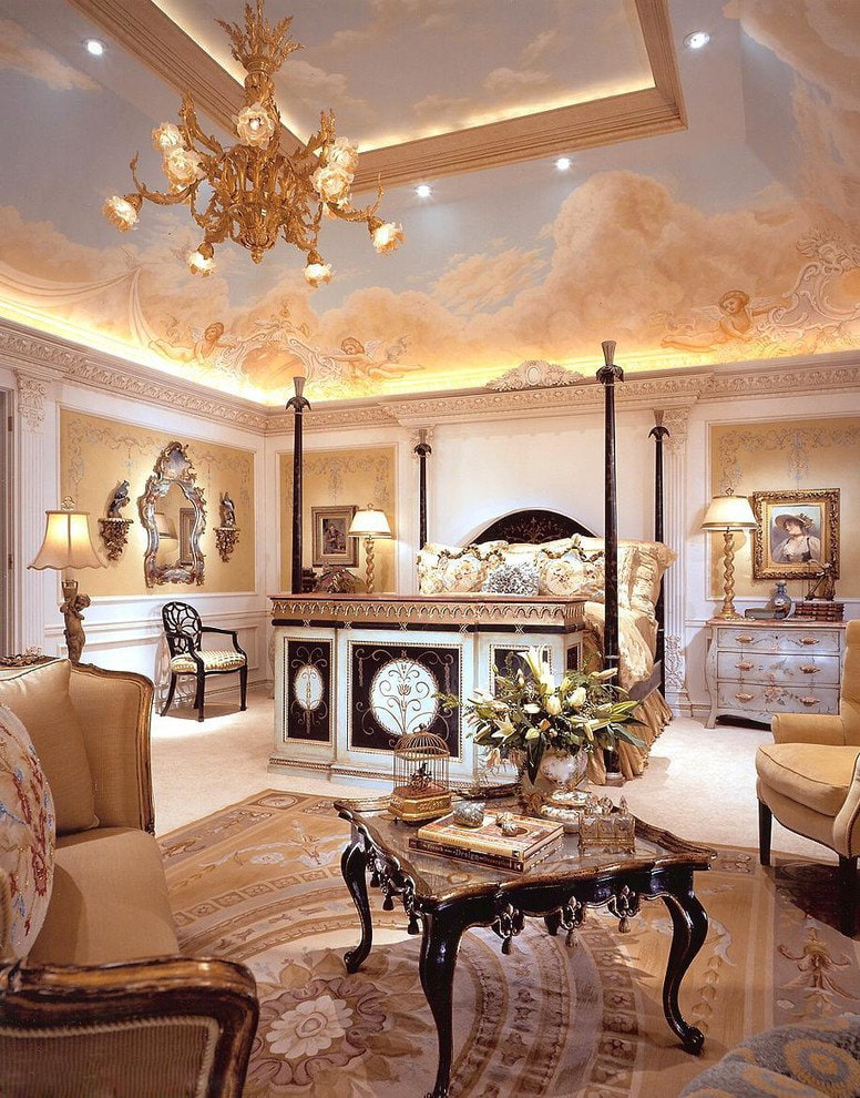 In order to decorate the ceiling, you can use painting together with plaster or polyurethane stucco molding. The ceiling should be high so that it does not "press" the pattern on the walls.