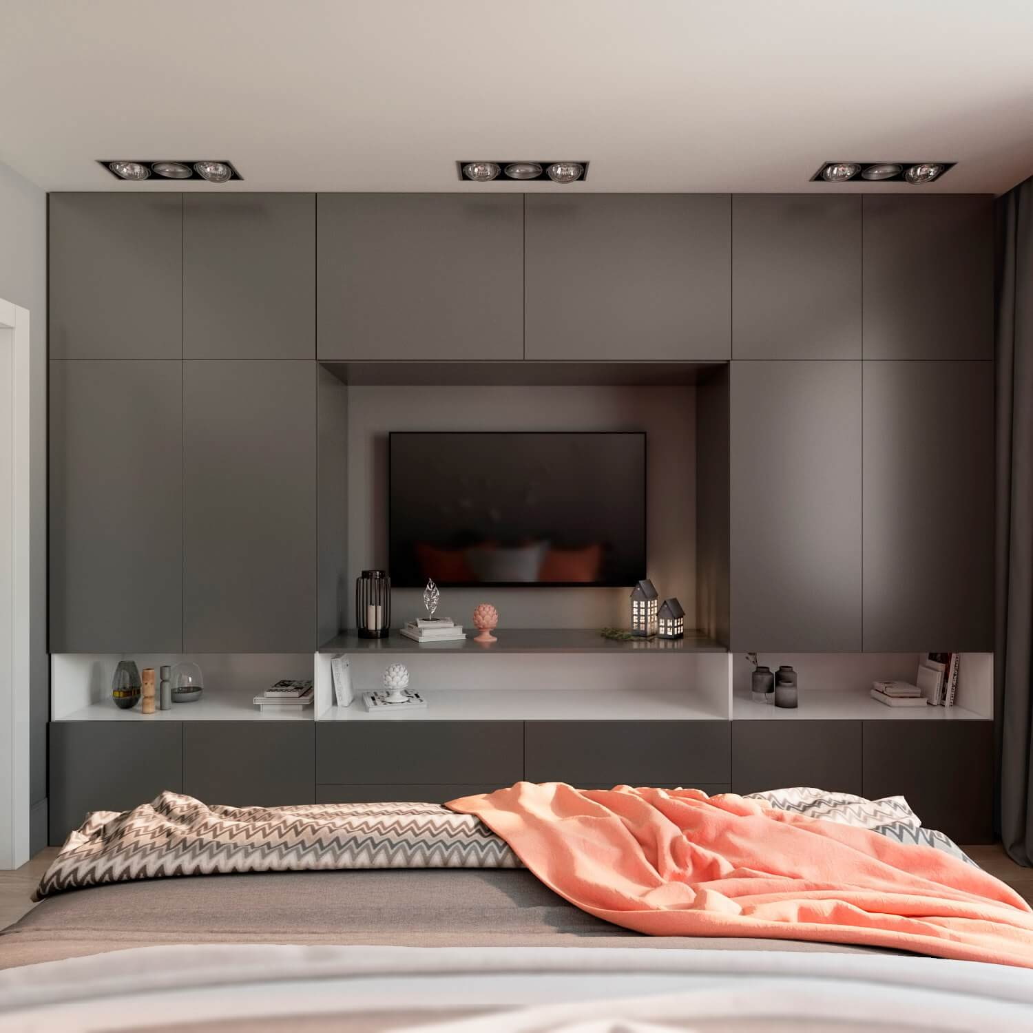 In the bedroom, you need to create an environment conducive to recuperation. To do this, be sure to think over dim lighting, choose a comfortable bed with a mattress. Perhaps it is worth considering the implementation of other tasks: storing clothes, evening reading, applying makeup.